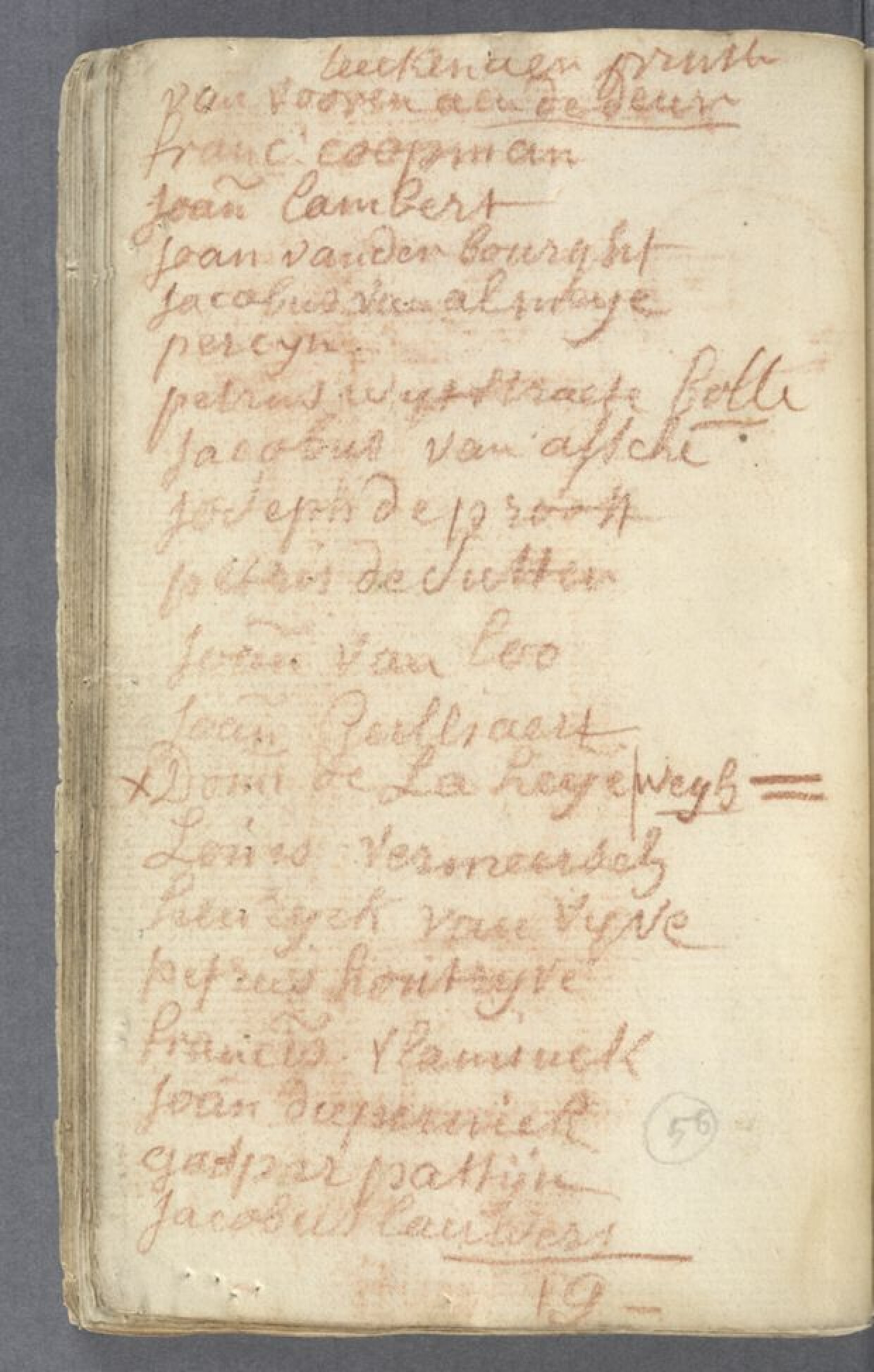 18de eeuwZesenvijftigste bladzijde [achtentwintigste blad, verso] uit een notitieboekje van Jan Garemijn als directeur van de Academie Brugge, daterend uit het schooljaar 1767-1768. Deze pagina bevat een lijst van leerlingen in de klas naar prenten, bij leraar de Rijcke. Garemijn gebruikte vaak afkortingen voor veelvoorkomende namen, in de vorm van suspensie met een krul boven de beginletters van de naam, zoals bij Joan[nes], Dom[inicus] en Francis[cus]. Bovenaan de bladzijde staat 'van vooren aen de deur', wat doet vermoeden dat de lijst opgesteld werd op basis van de zitplaatsen van de leerlingen. Zo is het hele verloop van deze lijst te vinden op vorige en volgende bladzijden, met soortgelijke plaatsaanduidingen.