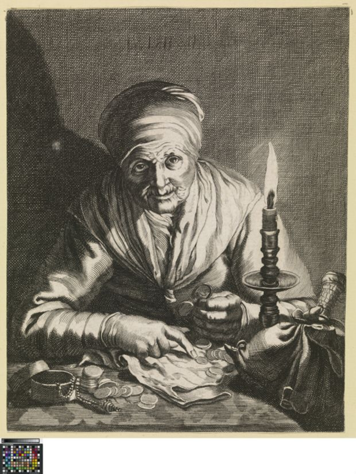 17de eeuwEen oude vrouw met een stokbeurs telt munten bij kaarslicht. Zij houdt een bril in haar linkerhand en wijst met haar rechterwijsvinger op de muntstukken die voor haar op tafel liggen. De prent is gemaakt door Hendrik Bary (Holl. I, 21). Deze prent heeft een sterker chiaroscuro effect dan de prent afgebeeld in Hollstein.