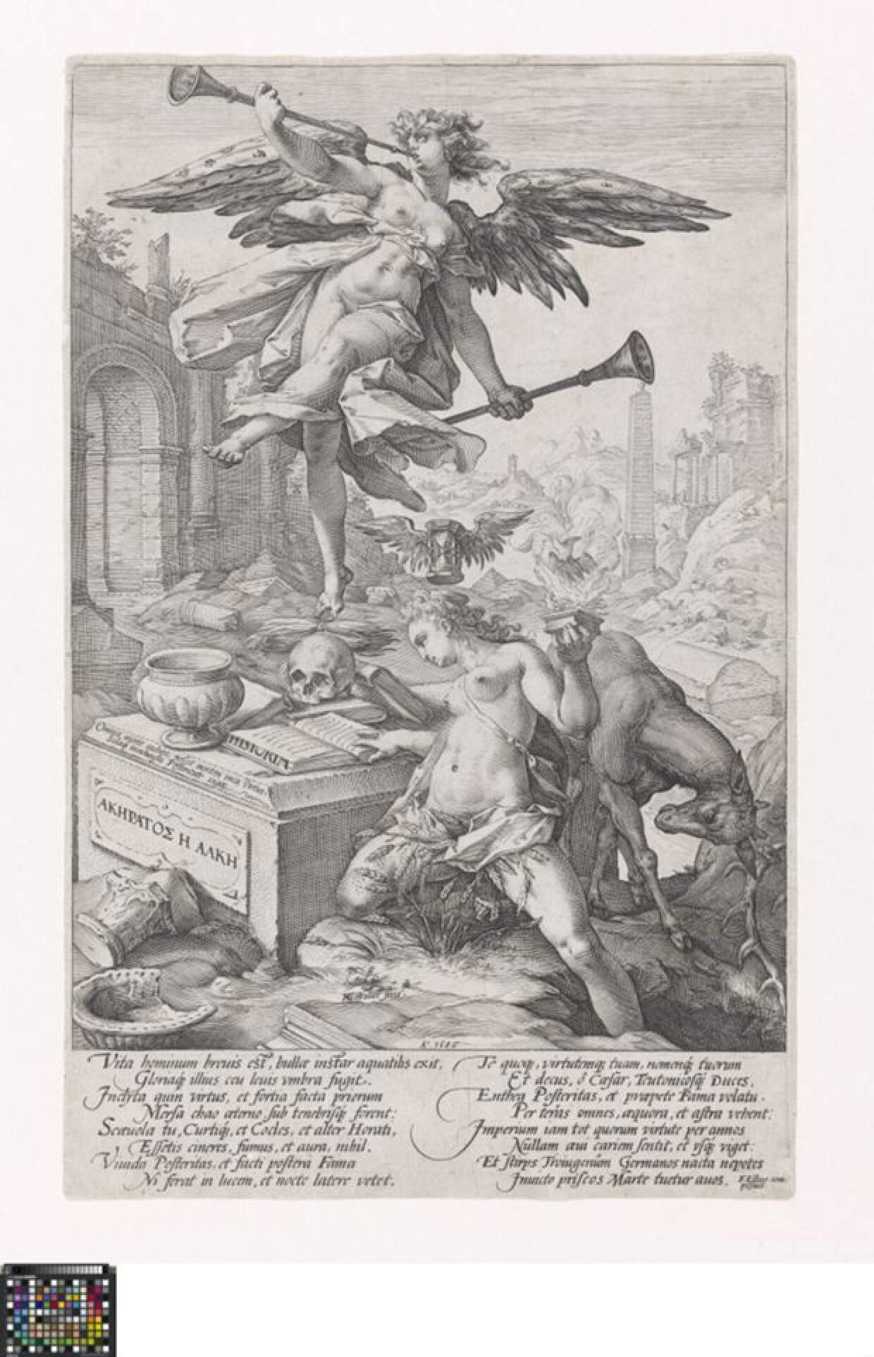 16de eeuwIn een landschap met klassieke ruïnes zijn vooraan Faam en Geschiedenis voorgesteld. Geschienis leest een dik boek met het opschrift 'Historia' en houdt een sokkel omhoog waarop een feniks uit zijn as verrijst. Boven haar zweeft Faam. Op haar vleugels zijn oren en ogen voorgesteld. Ze houdt twee trompetten vast. Tussen de figuren in zweeft een gevleugelde zandloper. Deze prent maakt deel uit van een reeks van tien, bestaande uit een ongenummerde titelprent, acht genummerde voorstellingen van helden en deze ongenummerde afsluitende prent.
