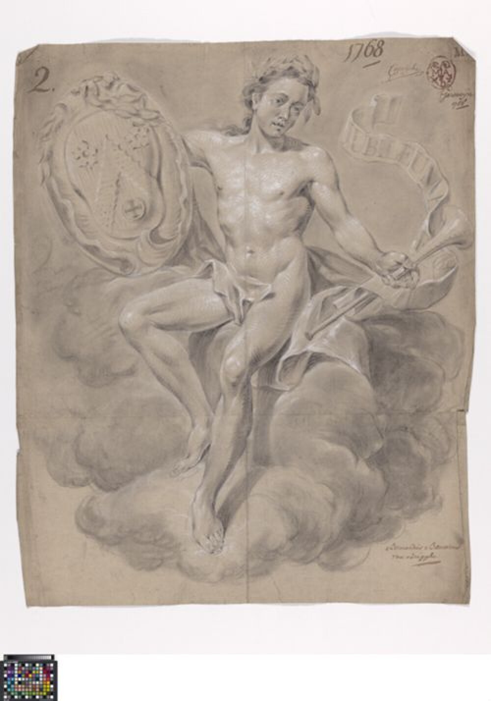 18de eeuwDertigste bladzijde [vijftiende blad, verso] uit een notitieboekje van Jan Garemijn als directeur van de Academie Brugge, daterend uit het schooljaar 1767-1768. De pagina bevat een lijntekening van een mannelijk naakt, zittend op een gestileerde wolk en weergegeven in driekwart naar links. De schouders en het hoofd zijn licht gedraaid en frontaal weergegeven. Het rechterbeen is opgetrokken en het linkerbeen is ontspannen. Het model houdt met geplooide rechterarm een wapenschild in zijn hand, steunend op zijn rechterknie. Met uitgestrekte linkerarm heeft hij een bazuin vast. De schets is gemaakt in grijs potlood en bevat weinig details in modellering. Het gaat om de negenentwintigste actie uit de klas naar model, geposeerd door het model Percijn op zes opeenvolgende dagen, startend op 22 februari 1768. Volgens Garemijns notitie werd naar deze pose getekend voor de wedstrijd om prijs. Aan deze en volgende bladzijden is te zien dat de klas naar model hiervoor in twee groepen werd gedeeld. De 'eerste klas' tekende deze frontale pose op de dagen hierboven vermeld. De notitie rechtsboven vermeldt dat Guillielmus Dumery eerste werd op de wedstrijd. De prijstekeningen van Dumery en Bernardus Bauwens, die tweede werd, zijn bewaard. Hun tekeningen (0016.GRO0025.II en 0016.GRO0026.II) vertonen meer details. Zo is het wapenschild van De Crits herkenbaar, met een keper, twee vijfbladbloemen en hostie of ring met kruis. Op de tekeningen staat de tekst 'Jubileum 1768' op een vaandel geschreven. Deze info noteerde Garemijn ook al in zijn notitieboekje, rechtsonder op de bladzijde. Zo werd met deze wedstrijd om prijs meteen ook het vijftigjarige jubileum van de Academie Brugge gevierd.