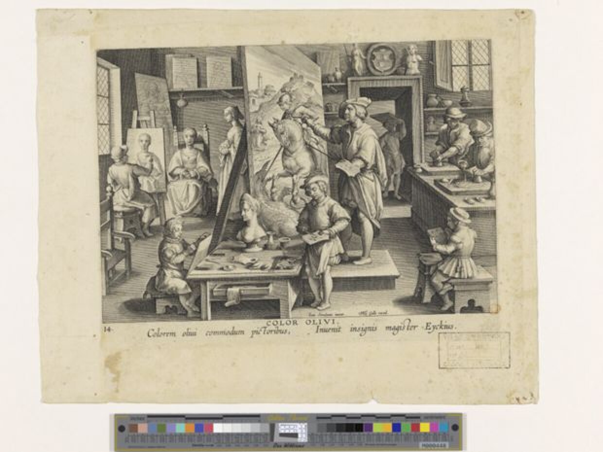 16de eeuwDeze prent toont het schilderen met olieverf als nieuwe uitvinding van de vroegmoderne tijd. Van Eyck is afgebeeld in zijn atelier als uitvinder van de vernieuwende schildertechniek, zoals ook het opschrift vermeldt. Het is de veertiende prent in een reeks van negentien excl. titelprent (New Hollstein, Johannes Stradanus, part III, 322-341, 336.II).