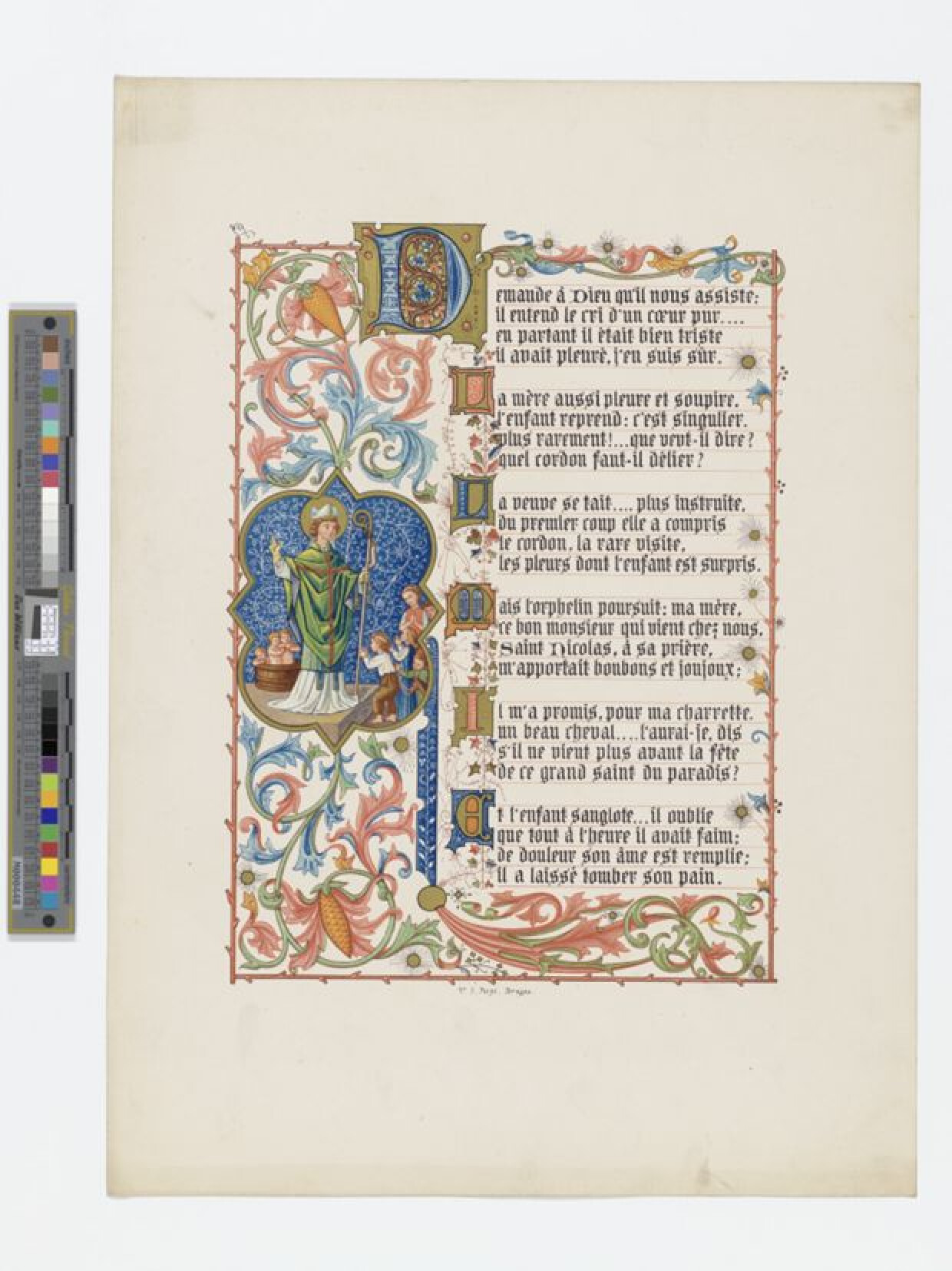19de eeuwEen chroomlithografie in neogotische stijl met geschreven sonnetten over liefdadigheid door Auguste Lepas. De sonnetten zijn in grote Gotische letters gedrukt. De marge is versierd met bloemen en Sint-Niklaas met een achttal adorerende kinderen worden afgebeeld. Twee engelen dragen een leuze over barmhartigheid. De litho maakt als eerste plaat deel uit van een door Jules Heilbig gemaakte reeks lithografieën ter herinnering van de bazaar in Luik in 1875. Deze originele serie van 7 platen werd op 155 exemplaren gedrukt door de Brugse uitgeverij Jacques Petyt. Schilder en kunsthistoricus Jules Heilbig wordt samen met Jacques Petyt beschouwd als de absolute koplopers van de Belgische neogotiek. Ze werkten dan ook vaak samen.