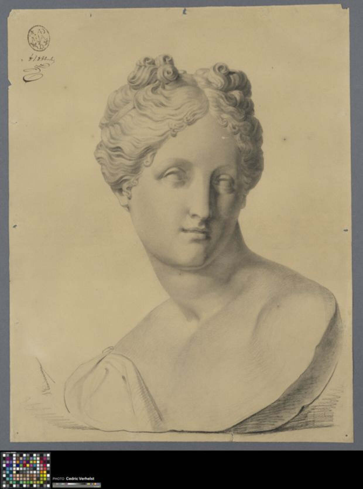 19de eeuwAcademische studie van een buste van Venus, getekend door Jean Vandermeire. Hij tekende deze studie als leerling aan de Academie Brugge, vermoedelijk in de klas naar het antiek (sculptuur). De tekening is ongedateerd, maar uit archiefonderzoek is wel geweten dat Vandermeire in 1854-1855 in deze klas les volgde. Hij werd toen vierde op de wedstrijd om prijs. Wellicht volgde hij de twee volgende schooljaren dus ook nog les in deze klas. De studie is getekend naar een buste van Venus, naar een detail uit 'Venere Italica' van Canova. De godin heeft lang krullend haar dat achteraan is samengebonden. Ze heeft een middenscheiding en draagt een fijne haarband. De buste is weergegeven in driekwart naar links, het gezicht frontaal afgebeeld. Een deel van het kleed, gedrapeerd over haar linkerschouder, is zichtbaar. Het gebruikte medium is zwart krijt of houtskool. De aantekeningen duiden op een wedstrijd, al is de letter waaronder Vandermeire zou hebben getekend nergens te zien. Daarnaast wordt ook de rangschikking van de leerling niet aangegeven. Linksboven staat wel de academiestempel met een handtekening van secretaris Vanden Abeele.