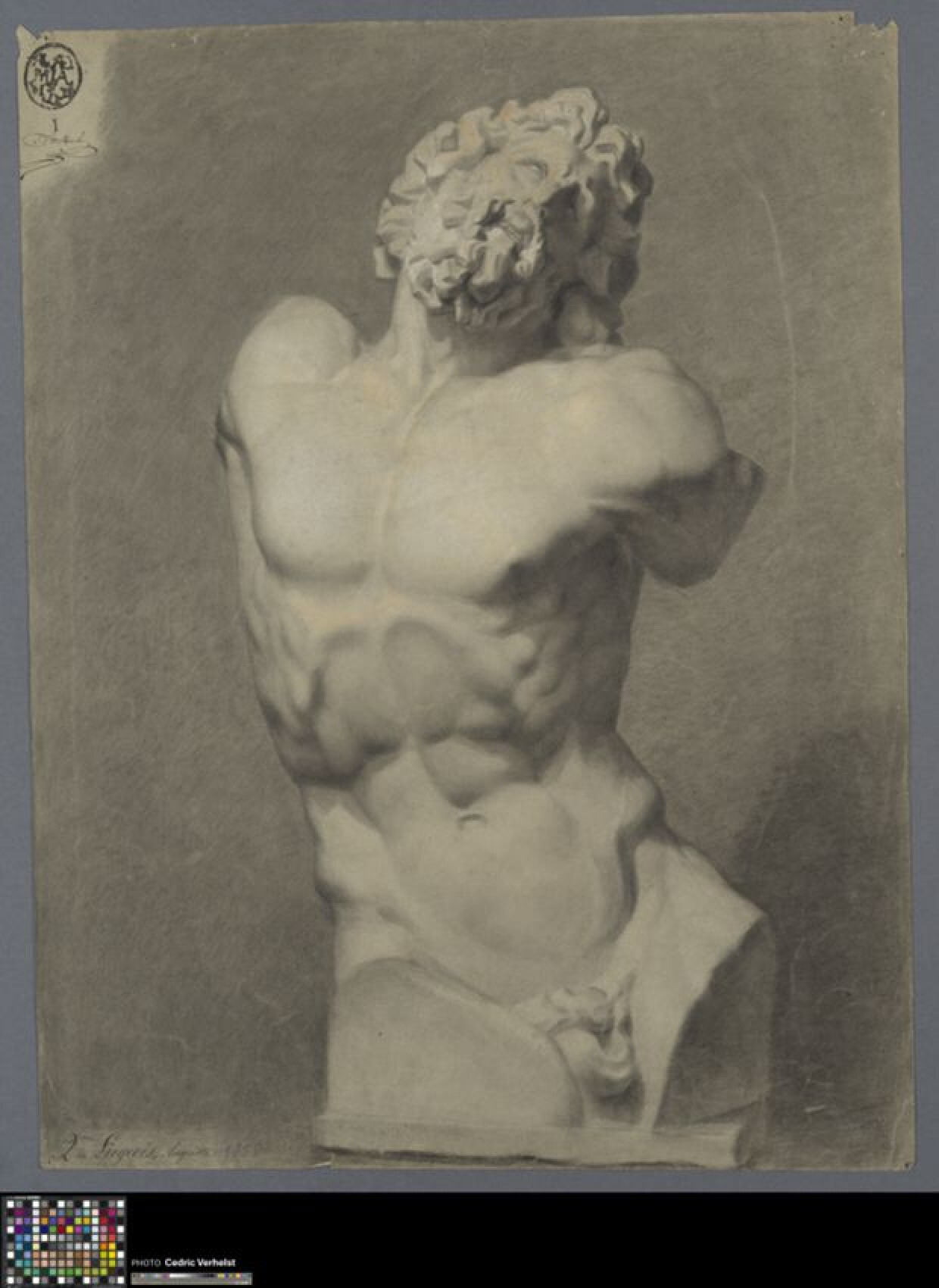 19de eeuwAcademische studie naar sculptuur van Laocoön, getekend door Auguste Liegeois. Liegeois maakte deze studie in de klas naar plaaster aan de Academie Brugge en werd ermee tweede op een wedstrijd. Wellicht was dit op de wedstrijd om prijs in 1855, waarbij Alphonse Naerts eerste werd (0022.GRO0668.II). Laocoön is frontaal afgebeeld als torso met hoofd, dus zonder armen en benen. De leerling tekende deze studie naar een afgietsel van dit detail uit de Laocoöngroep. Net als bij de originele beeldengroep staat de expressie en gepijnigde houding van Laocoön centraal. Voornamelijk het materiaalgebruik valt op bij deze tekening. Net als Naert gebruikte Liegeois naast zwart krijt of houtskool gehoogd met wit krijt, ook lichtoranje krijt. De aantekeningen duiden op zijn wedstrijddeelname. Linksboven staat zijn toegewezen letter 'I'. Daarboven is de academiestempel te zien, met een handtekening van secretaris Vanden Abeele. Dat Liegeois tweede werd, noteerde men linksonder bij zijn naam. Het jaartal werd er wellicht later aan toegevoegd.