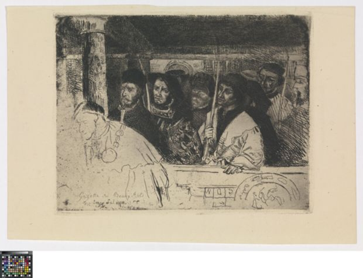 19de eeuwDe voorstelling toont een groep boogschutters van de Antwerpse schutterij. Ze kijken van onder een overdekt stuk naar een persoon aan de linkerkant.