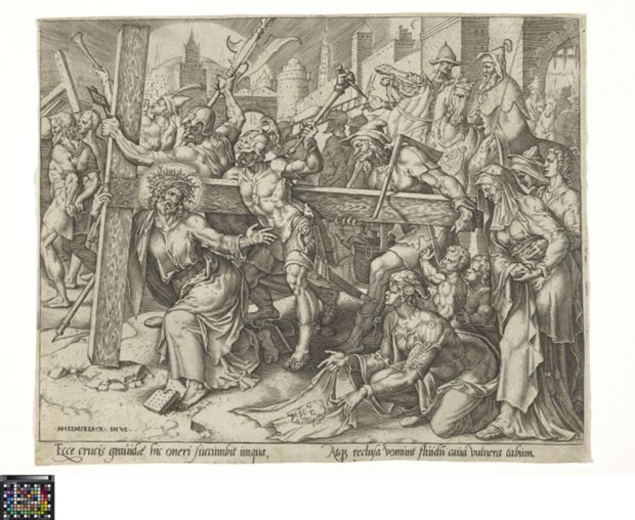 16de eeuwDe voorstelling toont Christus met de doornenkroon op zijn hoofd en het houten kruis op zijn rechterschouder. Het kruis is in de vorm van een Tau-kruis of Sint-Anthoniuskruis. Aan de rechterkant zit de heilige Veronica op haar linkerknie. In haar handen heeft ze de hoeken van de doek met het gelaat van Christus vast. De regels onderaan zijn ook opgenomen in Poëmatum Hadriani Junii Hornani Medici Liber primus: Continens Pia et Moralia carmina (gedrukt in 1598), p. 189.