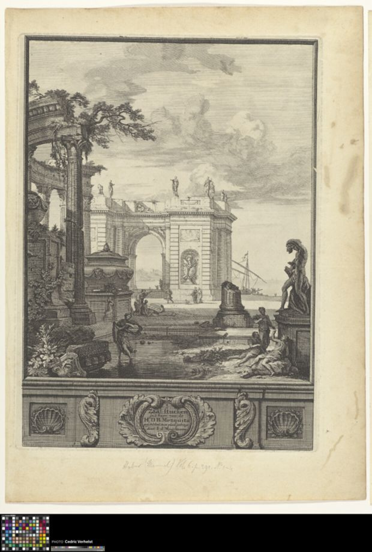 18de eeuwDeel van een serie van acht prenten. De prenten werden gemaakt door Isaac de Moucheron, naar schilderijen die hij had gemaakt voor het huis van de koopman David Bueno de Mesquita. Links in de voorstelling is de ruïne van een grote, ronde klassieke tempel te zien. Op de bovenste muur van de tempel staan enkele sculpturen opgesteld en vooraan in de voorstelling groeit een boom uit de vervallen stenen pilaar. Op de voorgrond is een ondiepe waterpartij aan de voet van de tempel afgebeeld, waarin een vrouw met klassieke kleding tot haar enkels in staat. Rechts op de voorgrond is een klassieke sculptuur op een sokkel te zien, met drie mannen aan de voet ervan. Op het grote plein voor de tempel zijn nog figuren afgebeeld. Door de boogvormige opening in de zijmuur van de tempel kunnen we een berglandschap aan de zee zien, met rechts naast de tempel de mast van een boot op het water. Onderaan in de voorstelling is een lage stenen muur afgebeeld, met een cartouche met daarin een inscriptie die de titel van de reeks en de maker ervan vermeld.
