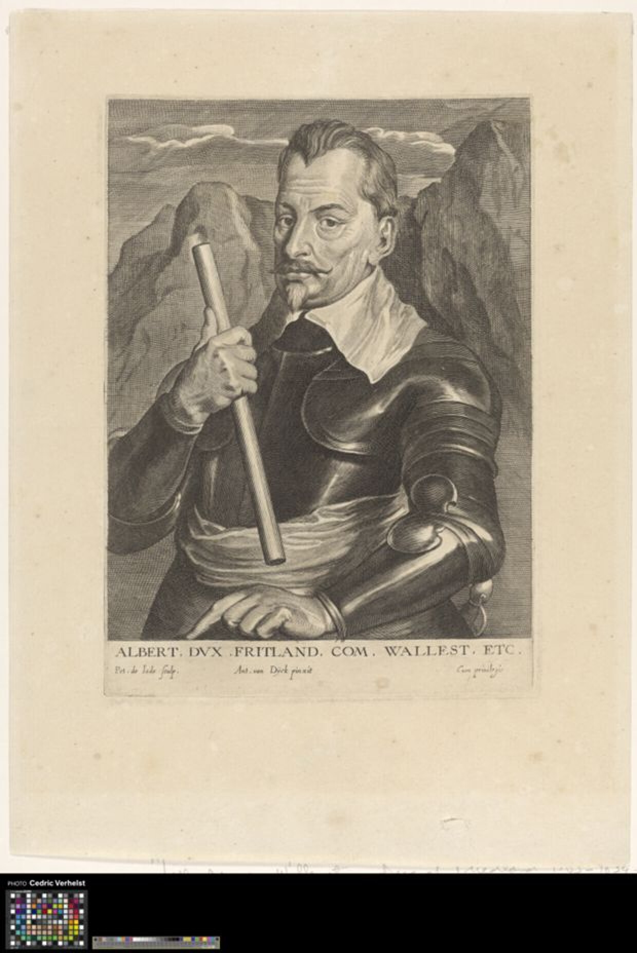 17de eeuwAlbrecht Wenzel Eusebius von Wallenstein (1583-1634), hertog van Friedland en Mecklenburg, was een opperbevelhebber van de keizerlijke troepen in de Dertigjarige Oorlog. Later werd hij door keizer Ferdinand II verdacht van verraad en door enkele van zijn officieren vermoord. Albrecht is hier ten halve lijve naar links geportretteerd, met het gezicht naar de toeschouwer gedraaid. Hij heeft kort, naar achter gekamd haar, een snor met opgedraaide punten en een sikje. Hij draagt een harnas met een witte kraag en een witte doek rond het middel geknoopt. Zijn zwaard hangt aan de linkerkant van zijn lichaam. Enkel het heft is te zien. De linkerarm is gebogen en rust op de rand van de voorstelling. De rechterarm is tot voor de borst gebogen om de commandostaf die vastgehouden wordt in de rechterhand goed te kunnen tonen. Op de achtergrond zijn bergen en een lucht te zien. Onder de voorstelling staat een regel identificatie in het Latijn.